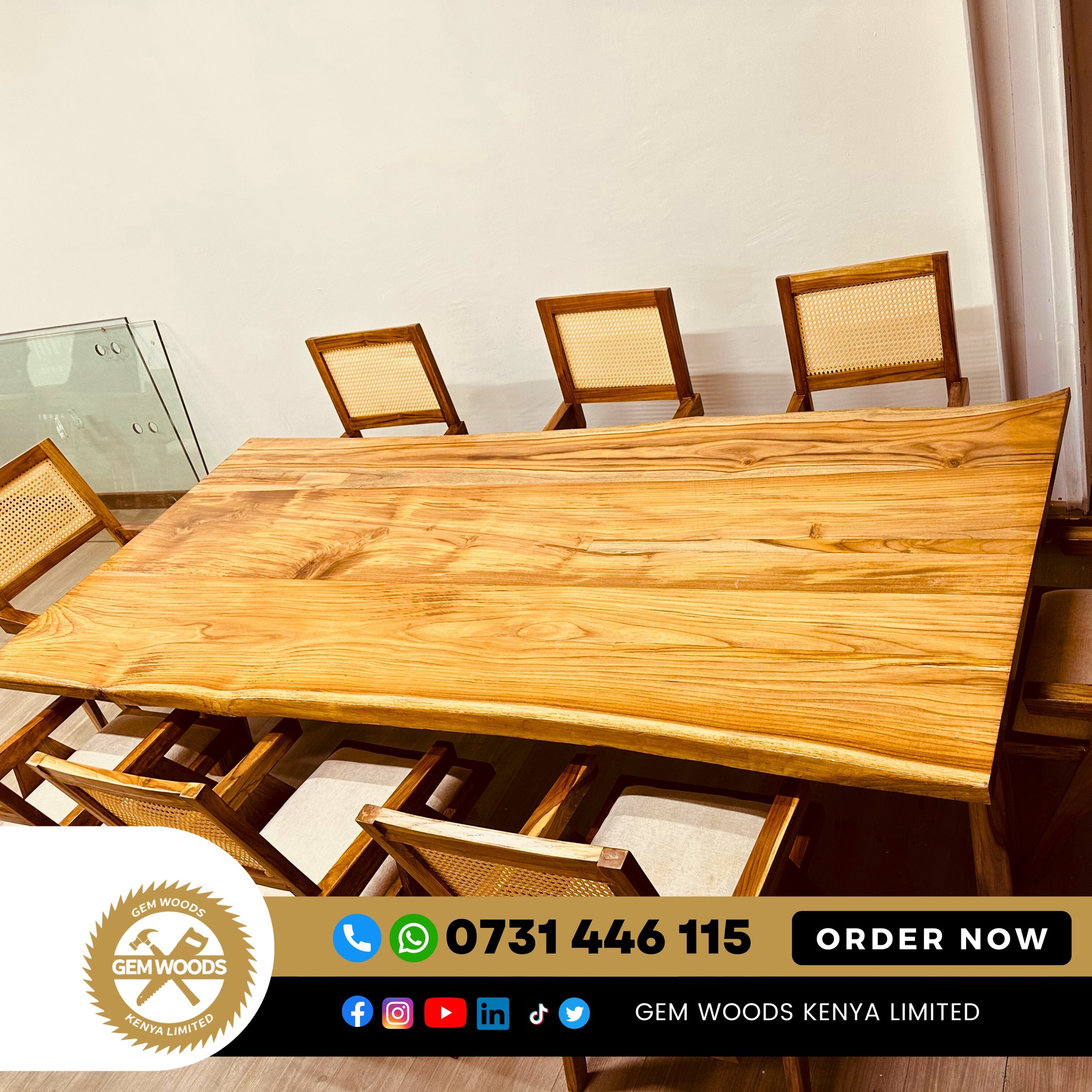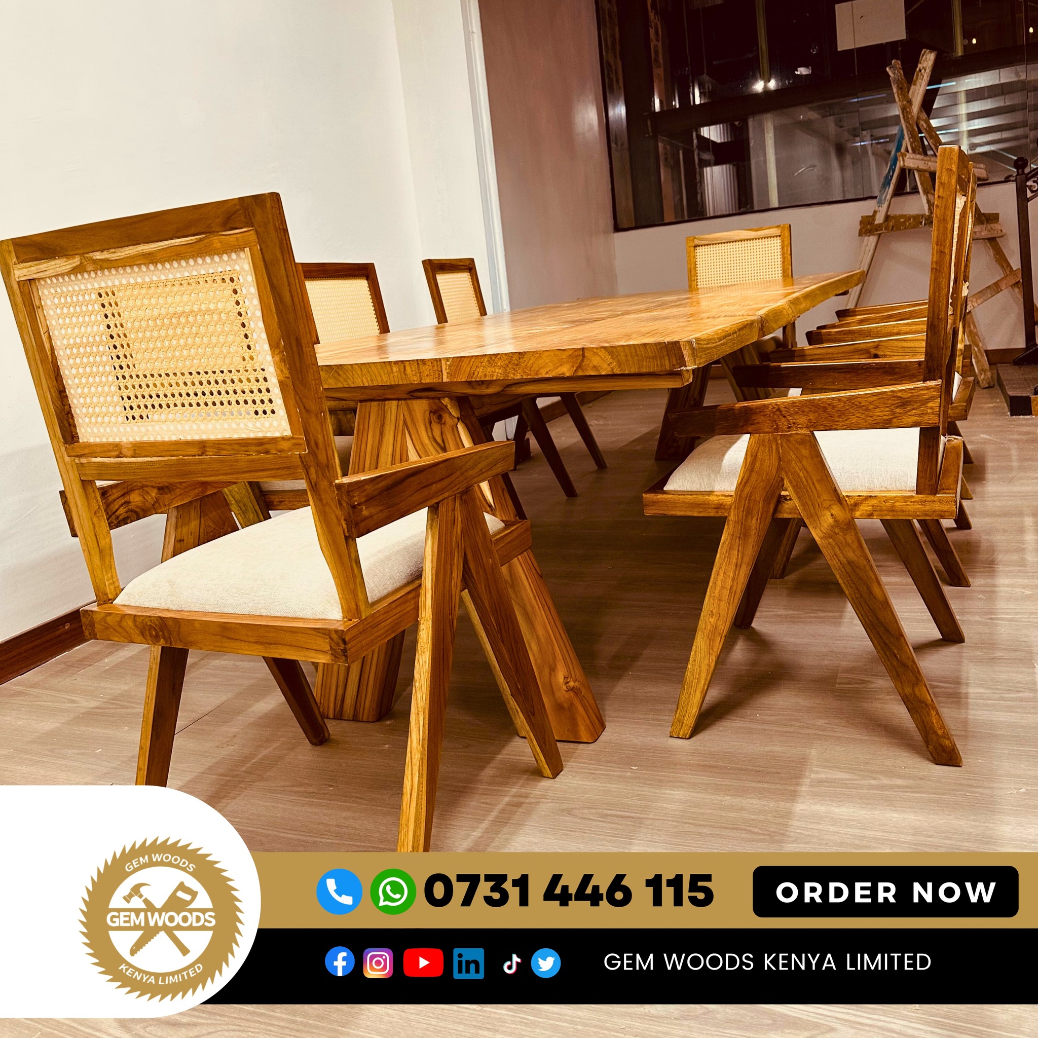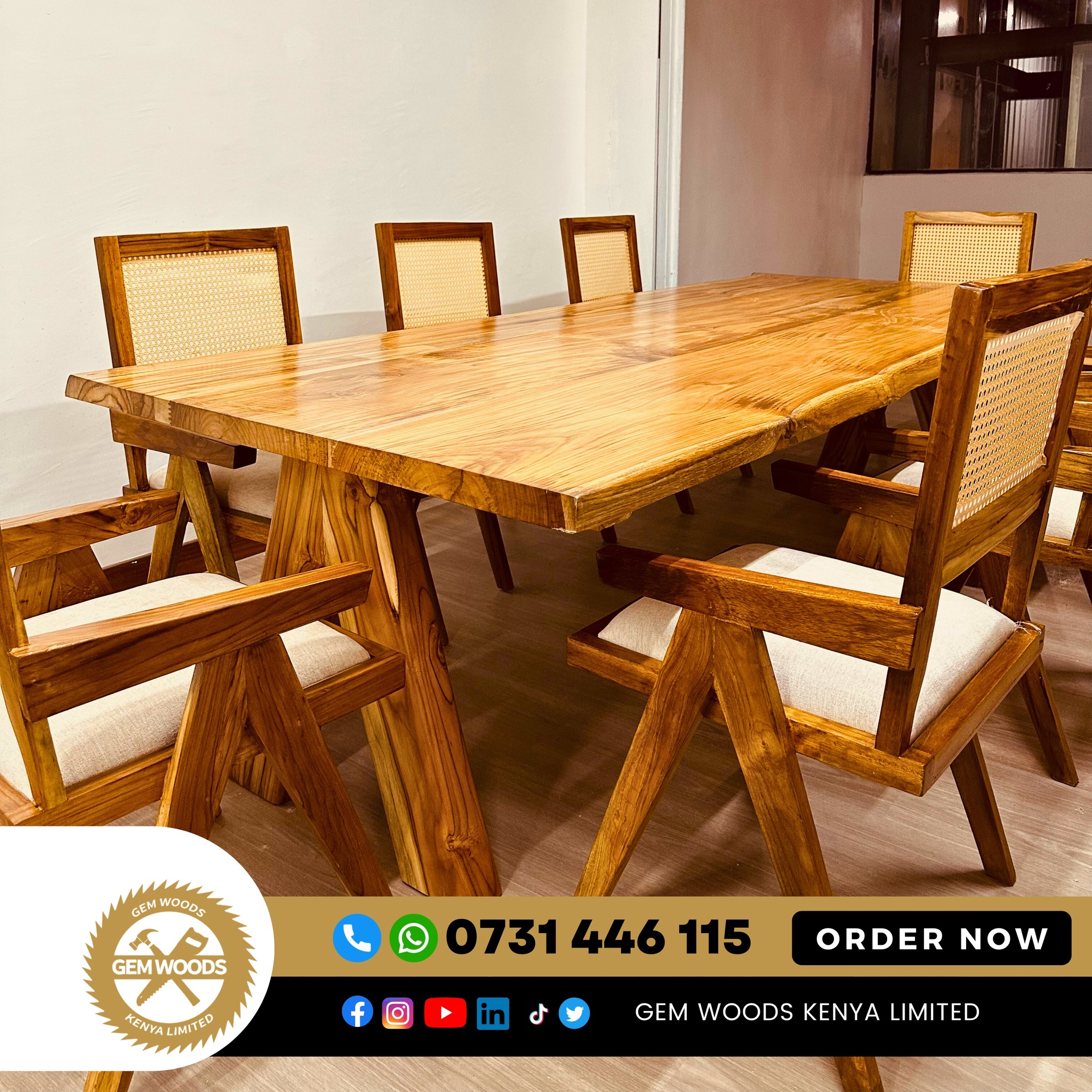 Bring warmth, elegance, and durability to your dining space with the Sudan Teak 8-Seater Dining Set from Gem Woods Kenya. Crafted from premium Sudan teak hardwood, this dining set combines natural beauty with exceptional strength, making it ideal for everyday family meals and sophisticated gatherings.