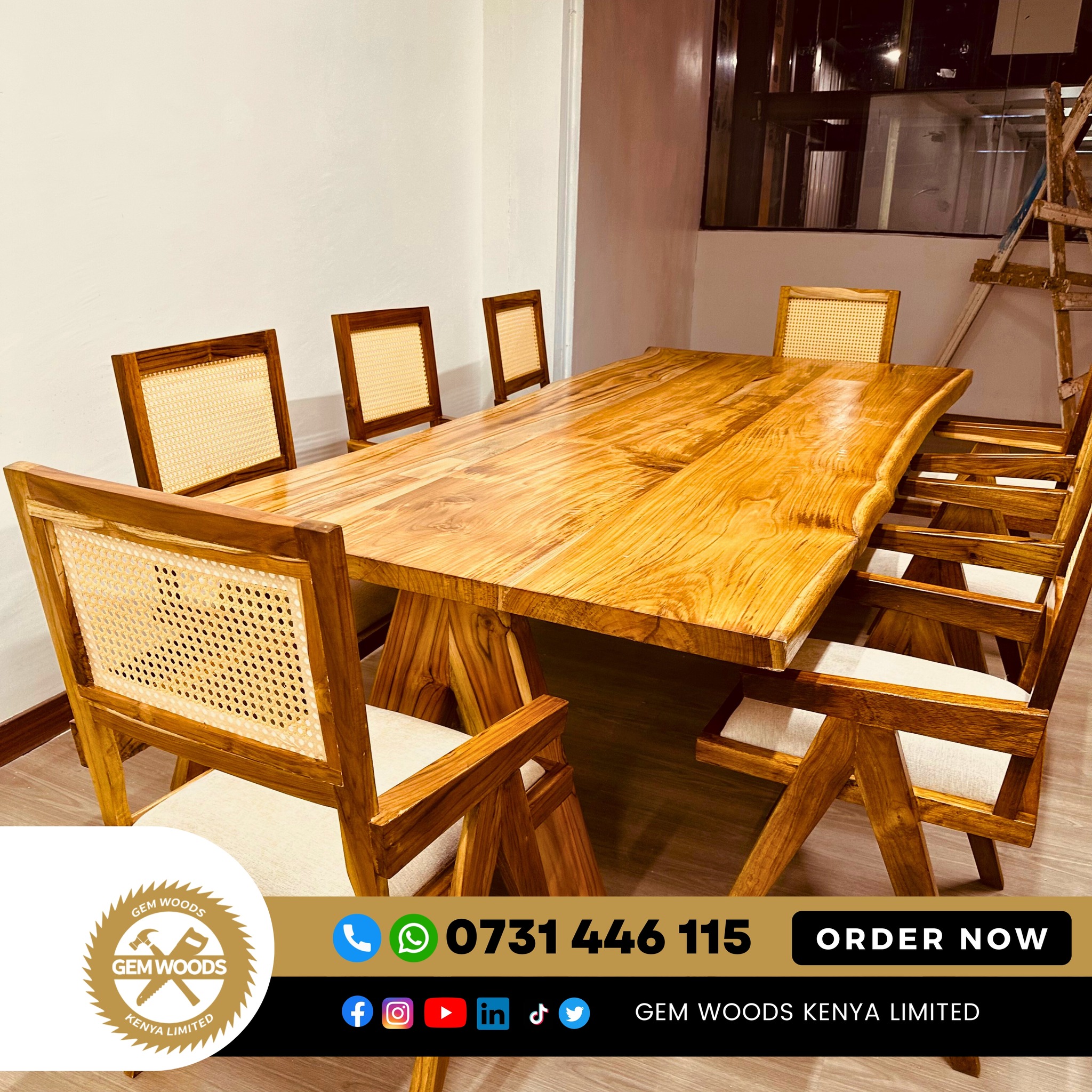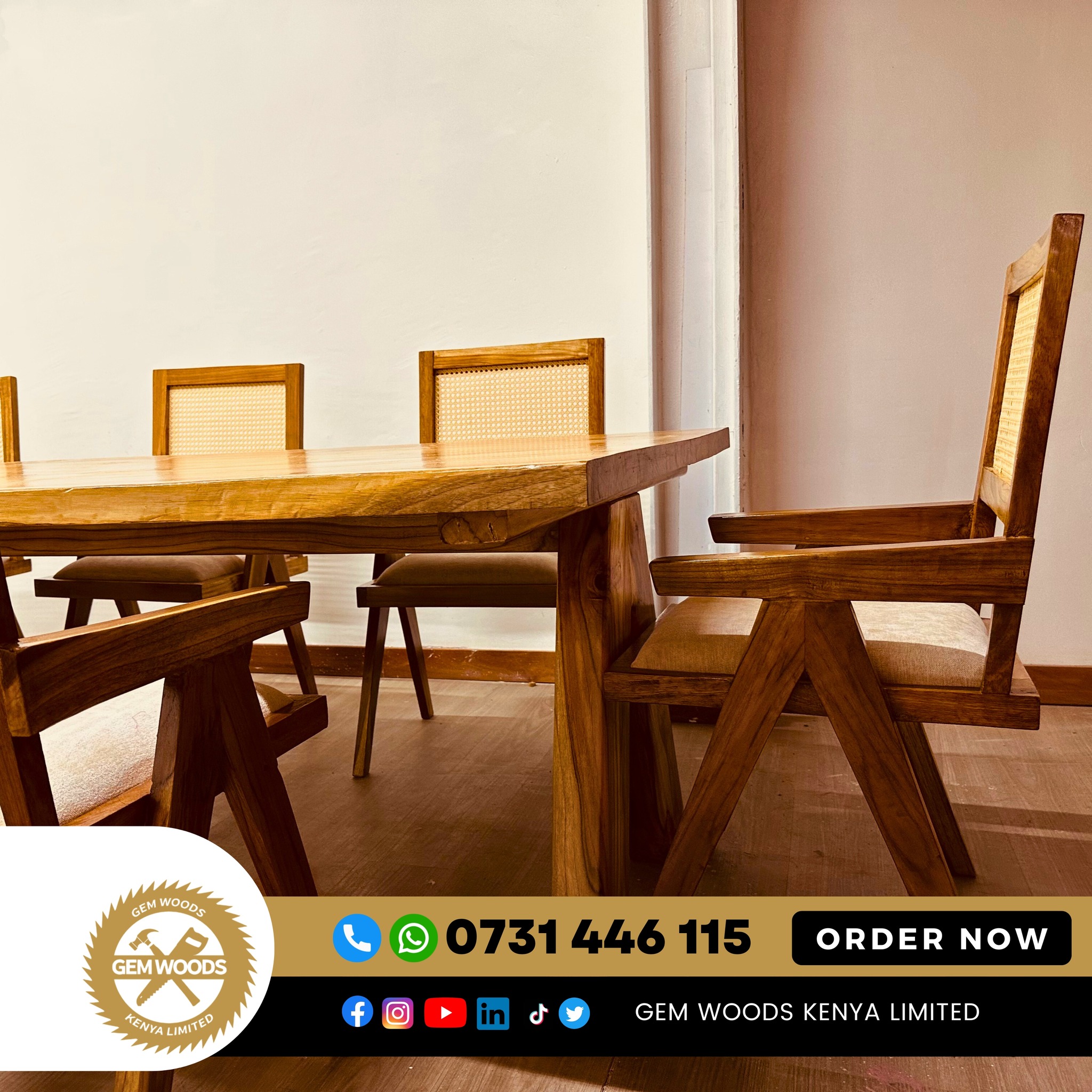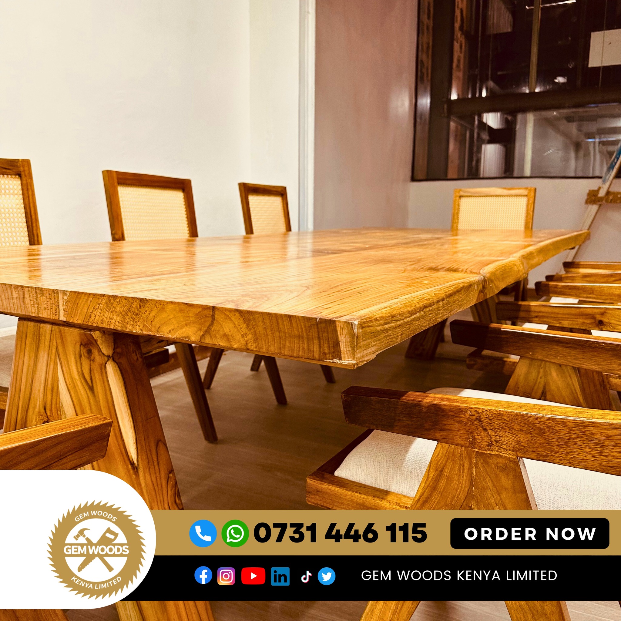 Bring warmth, elegance, and durability to your dining space with the Sudan Teak 8-Seater Dining Set from Gem Woods Kenya. Crafted from premium Sudan teak hardwood, this dining set combines natural beauty with exceptional strength, making it ideal for everyday family meals and sophisticated gatherings.