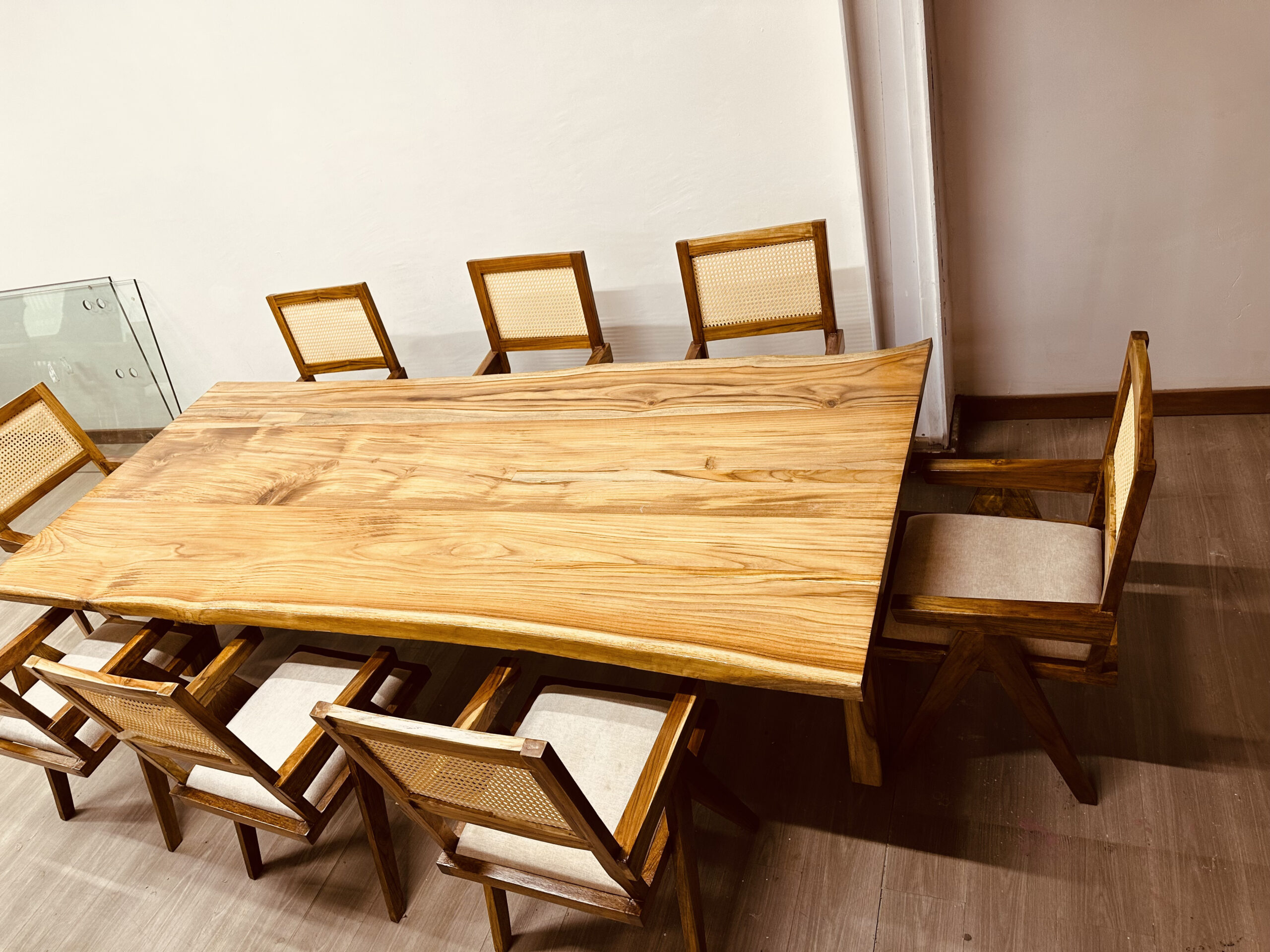 The rich grain patterns and warm tones of teak give each dining set a unique character, while the solid hardwood construction ensures long-lasting performance. Designed to comfortably seat eight people, the spacious table offers both style and practicality for larger households, restaurants, and hospitality spaces.